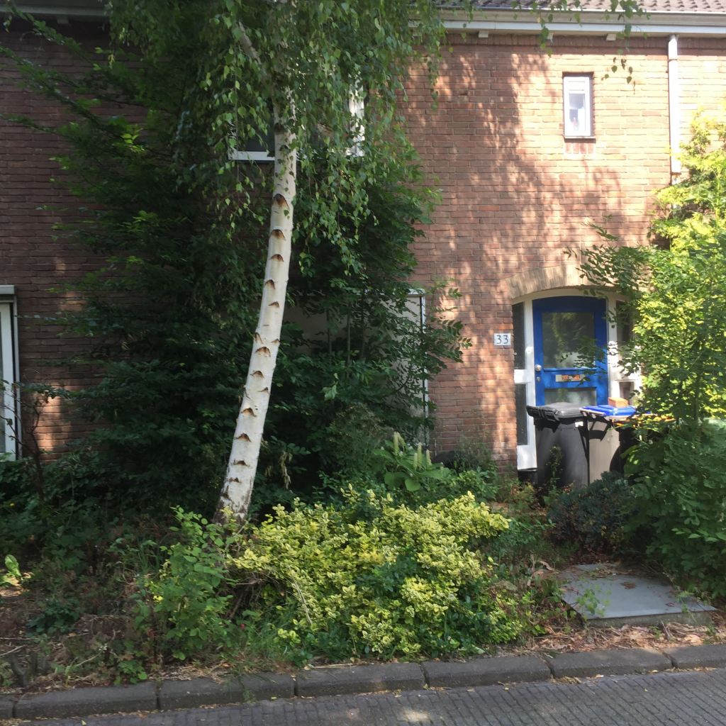 Ze had zo ook geen zicht op de voortuin, de trots van mijn vader, tuinman en – in het werkende leven – ook tuinbaas (van het Academisch Ziekenhuis Utrecht) van beroep. Een sobere tuin vol planten en bloemen die geen van allen boven het raam uitkwamen. Hoe anders was het nu: hele bomen stonden voor het gesloten raam en toornden zelfs boven de dakrand van de eerste verdieping uit. Op het pad naar de voordeur stonden nog steeds afvalbakken.