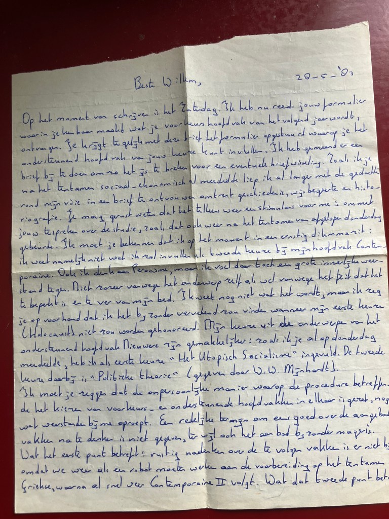 De briefwisseling begon met een prozaïsche aanleiding: we hadden besloten als voorkeursvak contemporaine geschiedenis te volgen en ons ingetekend voor het volgen van een vak over de historiografie van de Holocaust. Willem stuurde me het formulier waarin hij kenbaar maakte wat zijn voorkeur was en ik nam het initiatief voor een briefwisseling door hem op 28 mei 1983 te schrijven: “Je mag gerust weten dat het telkens weer een stimulans voor me is om met jou te spreken over de studie’.