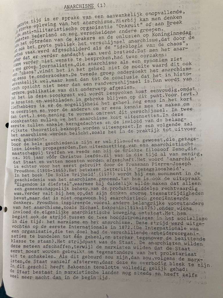 Maar hoe schreef ik erover? Omdat in die tijd de antimilitaristische groep Onkruit van zich deed spreken en krakers tijdens de kroning van koningin Beatrix in 1980 onder het motto ‘geen woning, geen kroning’ een veldslag in Amsterdam hadden ontketend, lag het anarchisme voor de hand. Niet dat ik sympathie voor Onkruit of de krakers had: de 19-jarige die ik toen was, was een ‘theoretisch’ lezer over het anarchisme en had juist de bundel De volle vrijheid gelezen, waarin onder meer opstellen van Anton Constandse, van wie ik destijds alles las waar ik mijn hand op kon leggen. Ik gaf aan de hand van dat boek een beknopte samenvatting van de geschiedenis het anarchisme, met slechts één eigen accent: mijn voorkeur voor Max Stirner boven alle andere anarchisten. Ietwat hoogdravend schreef ik: ‘Tegen elke vorm van dogmatisme en tegen elk idee van collectivisme heeft Stirner gestreden’. Ik verbond Stirner met mijn andere held van destijds, Sartre, die ik ook als anarchist beschouwde.