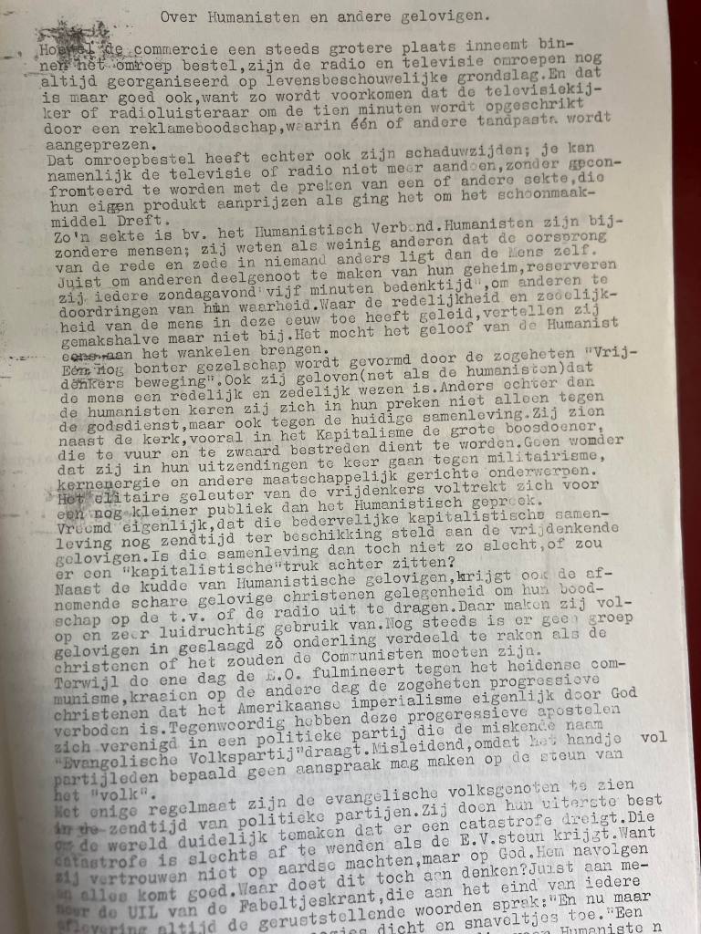 In datzelfde nummer uit 1983 stond mijn meest curieuze beschouwing, polemisch getiteld Over Humanisten en andere gelovigen. Ik schreef daarin enigszins agressief dat je de radio of televisie niet aan kunt doen ‘zonder geconfronteerd te worden met de preken van een of andere sekte, die hun eigen product aanprijzen als ging het om schoonmaakmiddel Dreft.’ Zonder met de ogen te knipperen omschreef ik vervolgens het Humanistisch Verbond als een sekte. ‘Juist om anderen deelgenoot te maken van hun geheim, reserveren zij iedere zondagavond vijf minuten bedenktijd om anderen te doordringen van hun waarheid. Waar de redelijkheid en zedelijkheid van de mens in deze eeuw toe heeft geleid, vertellen zij er gemakshalve maar niet bij. Het mocht het geloof van de Humanist eens aan het wankelen brengen.’