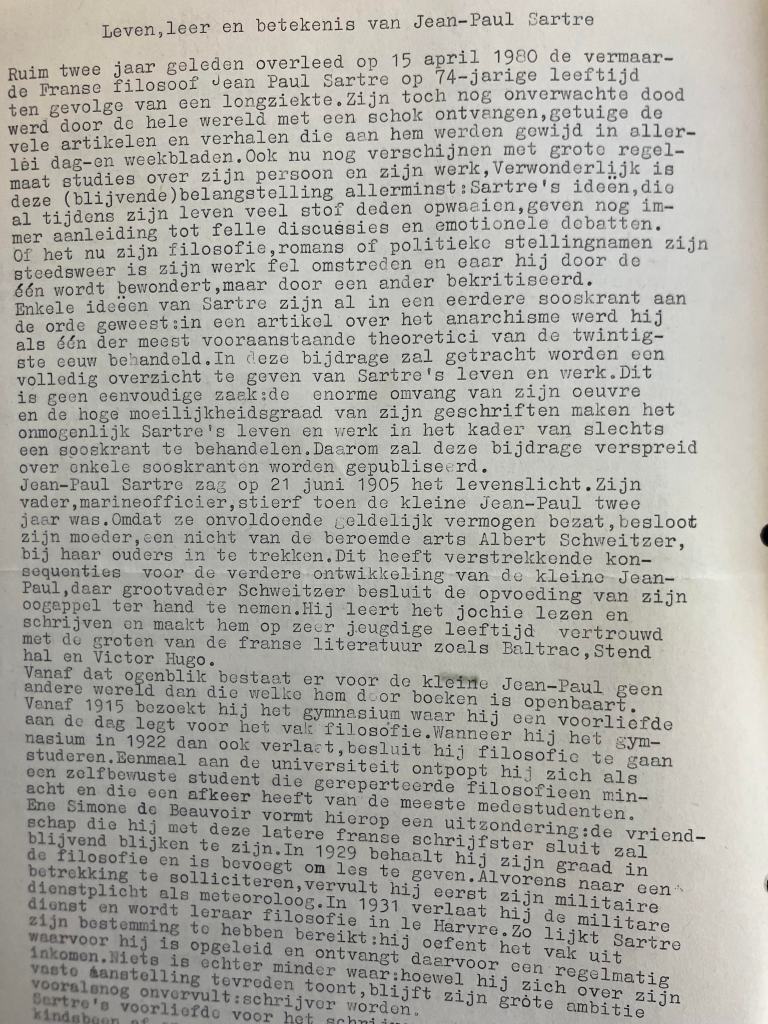 Over Sartre schreef ik twee jaar later, in augustus 1982, onder de wat pretentieuze titel Leven, leer en betekenis van Jean-Paul Sartre. En zoals het artikel over het anarchisme een overzicht moest bieden aan de ‘soosgangers’, zo ook dat over Sartre. En nog een overeenkomst: beide artikelen, waarop ik een vervolg had aangekondigd, bleven onvoltooid. Bij Sartre (1905-1980) bleef ik zelfs steken in 1938, bij een uitvoerige bespreking van zijn debuutroman La Nausée (Walging).