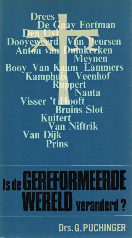 Als gezegd: ik heb dat archief nog niet kunnen inzien, ook de brieven niet die ik zelf met hem gewisseld heb. Wel kan ik op grond van persoonlijke ervaring zeggen dat Puchinger een persoonlijkheid was die je voorheen wel maar tegenwoordig niet of nauwelijks meer in de wetenschap aantreft, ook in de geschiedwetenschap niet. Hij was niet alleen op grond van zijn biografie een eenling, hij was het ook als intellectueel die bovendien de tijd mee had. Wie loopt er nu nog zoveel colleges in zo uiteenlopende vakken, wie kan nu nog zolang studeren? Wie kan bogen op een zo uitgebreid oeuvre, een mengeling van geschiedschrijving, journalistieke beschouwingen en vele interview-bundels, waarvan Is de gereformeerde wereld veranderd? (1966) [hier is het omslag afgedrukt] er slechts een van twaalf (!) is. George Puchinger kan met recht een 19e-eeuwer worden genoemd, hoewel hij in de 20ste eeuw leefde en de verschrikkingen van die eeuw beleefde. En ook de verzuiling, al schijn je dat woord van academici niet meer te mogen gebruiken. Ik doe dat welbewust nog wel en zeg ervan: op zijn manier heeft George Puchinger zich niets aangetrokken van de hokjesgeest.